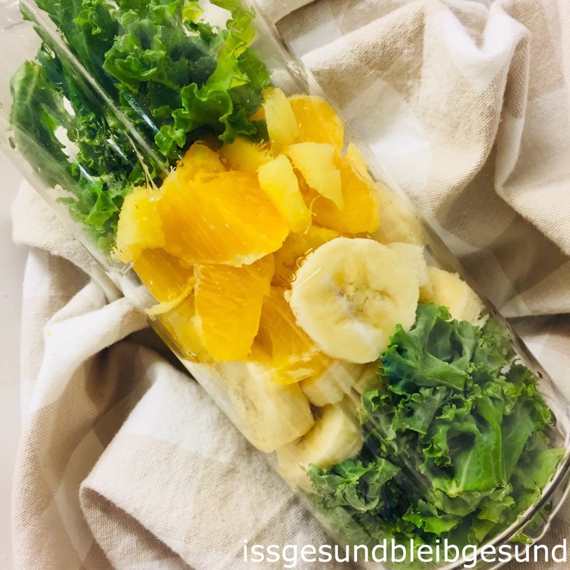 Grünkohlblätter gut waschen, die dicken Blattrippen ausschneiden und das Blattgrün klein schneiden, geschälten und in Scheiben geschnittenen Ingwer mit Bananen- und Orangenstücken und Wasser mit dem Mixer verarbeiten. Fertig 👍