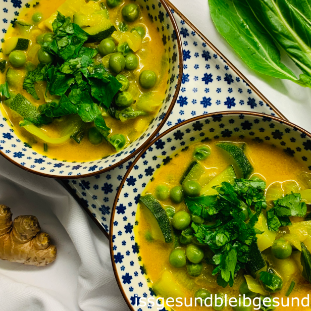 gestillt. Erbsen, Zucchini, Pack Choi, frische Petersilie kombiniert mit Kokosmilch, Lemon-Curry, Kurkuma, Ingwer. 👍
