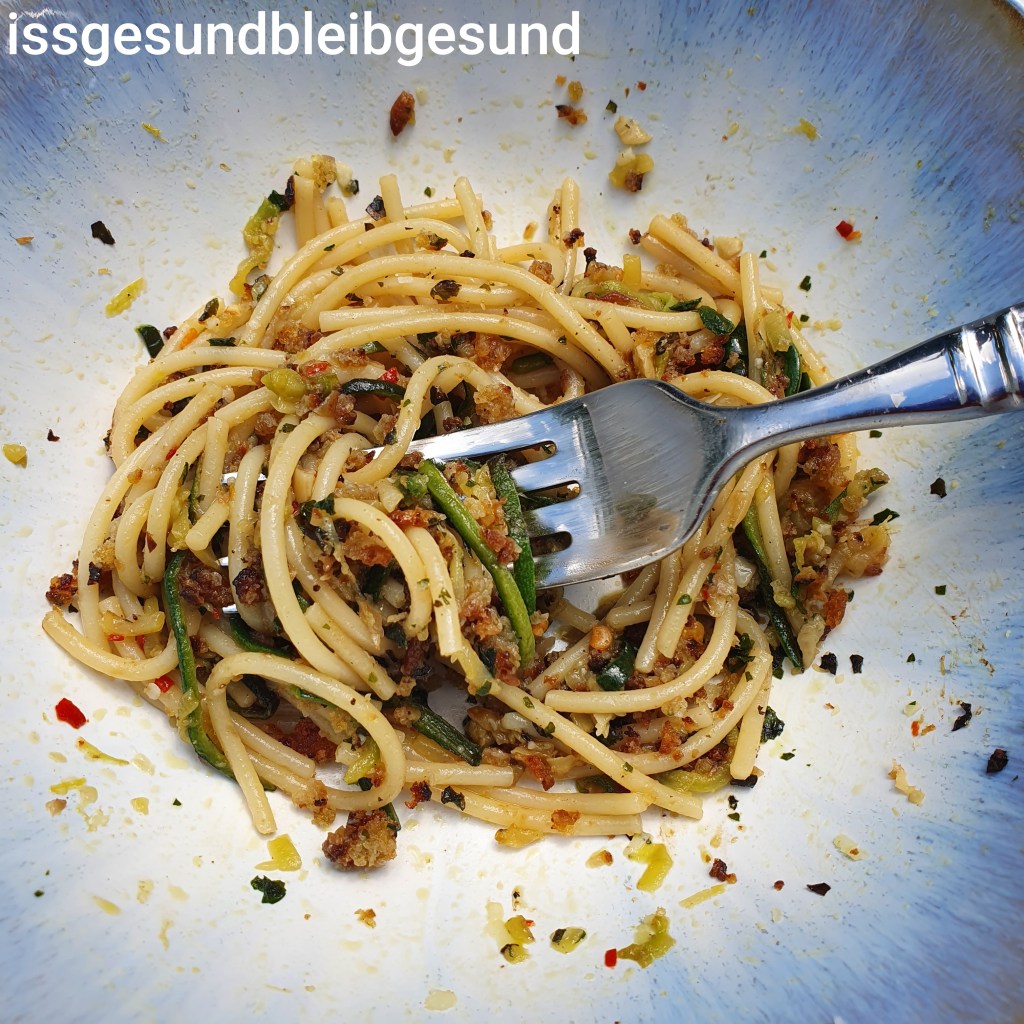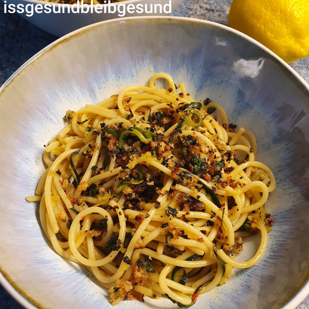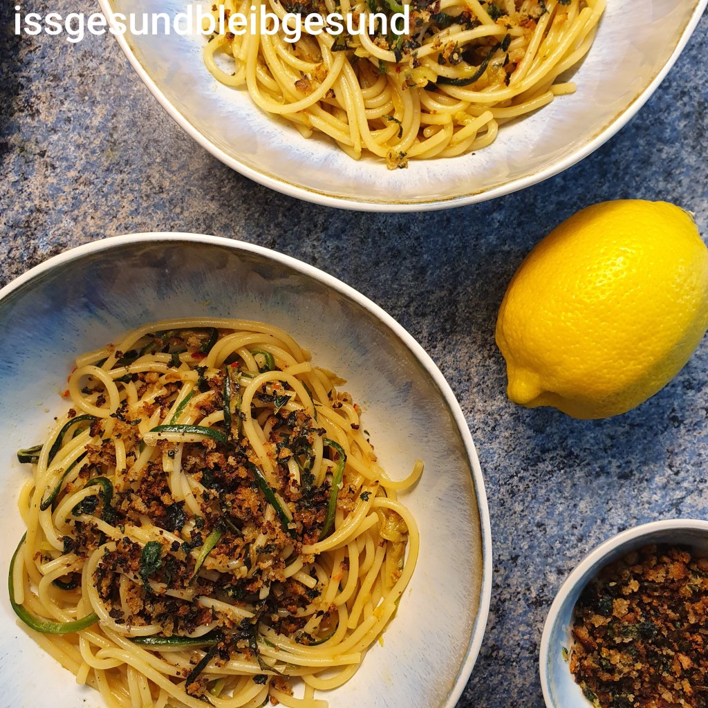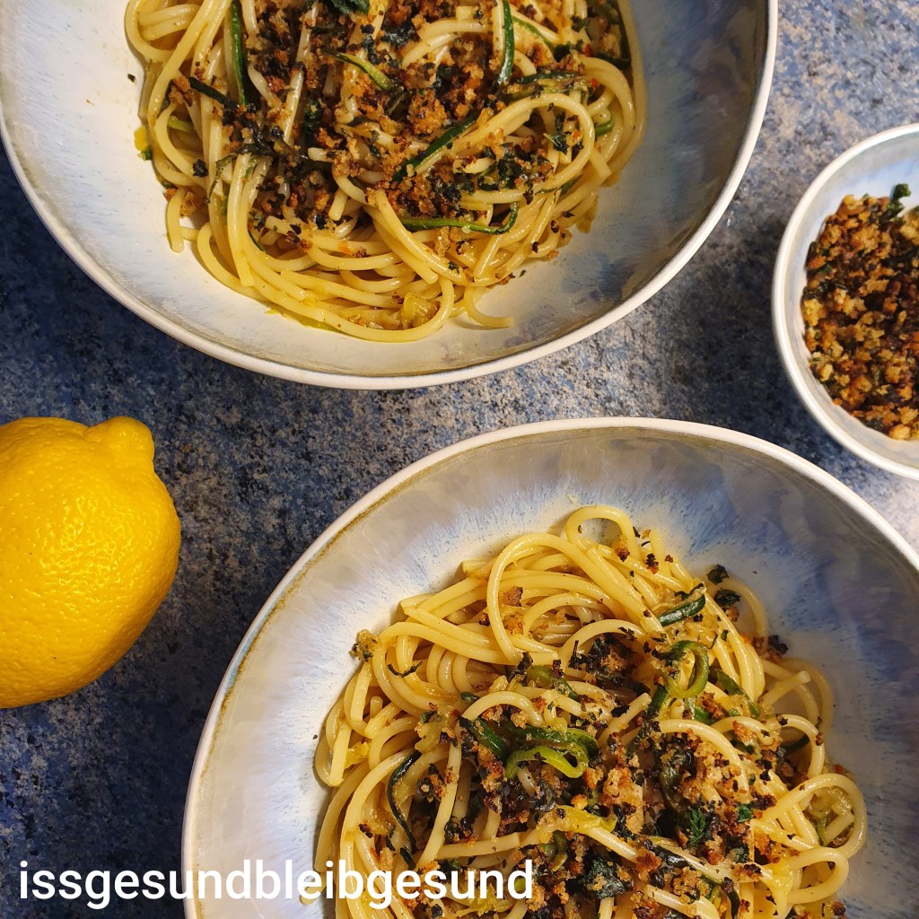 Das sind Zitronen-Spaghetti mit Zoodles und gerösteten Brotbrösel aus Brotresten, anstatt von Parmesan für den Crunch.
