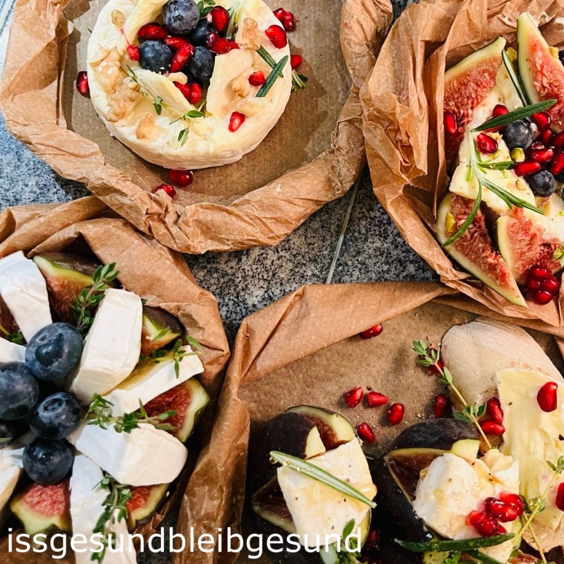 Zuerst werden runde Backpapier-Nester geformt und das Backrohr auf 180 Grad Umluft vorgeheizt. Dann wird der runde Käse (ohne Verpackungspapier) in die Form gesetzt und leicht eingeschnitten oder die großen dreieckigen Stücke vom Camembert, wie bei meinem Käse-Törtchen, nochmals geteilt und mit den Toppings versehen.
