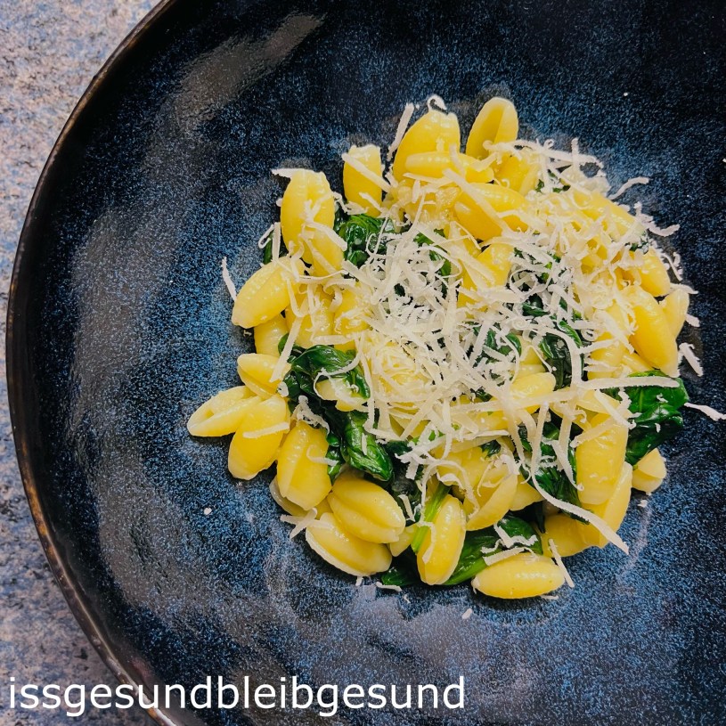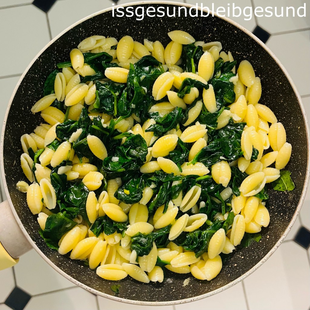 Pasta abseihen und mit Spinat und Parmesan toppen.