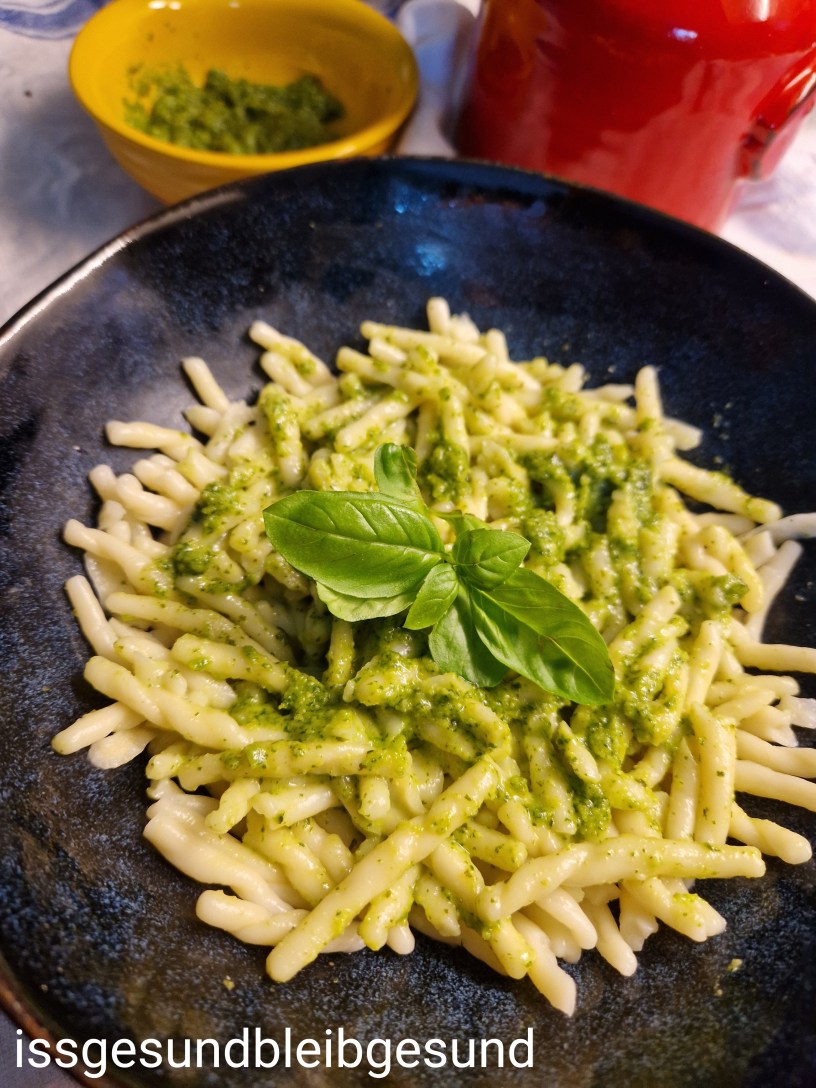Pesto und Pasta, das ist die ganz große Liebe. Das Pesto umarmt innig jede einzelne Nudel, als wäre es nur dafür gemacht.