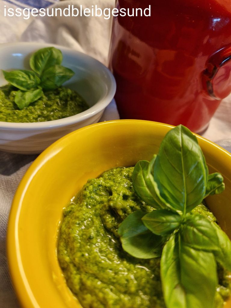 Traditionell wird das Pesto mit Mörser und Stößel zubereitet (Pesto aus dem italienischen pestare – zerstampfen). Funktioniert aber auch in einem Multizerkleinerer.